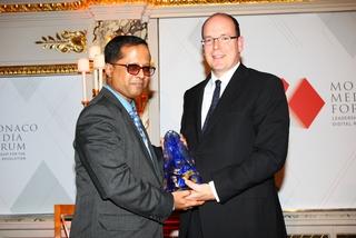 Lors de la cérémonie de Remise de Prix du Monaco Media Forum, le vendredi 9 novembre à l'Hôtel de Paris, le Jury présidé par le Prix Nobel Elie Wiesel, a attribué un prix spécial à Salah Uddin Shoaib Choudhury, journaliste au Bangladesh remis par SAS le Prince Albert II.