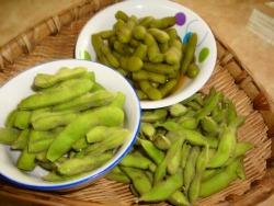 On trouve à l'automne des gousses fraiches de soja, leur cosse verte est recouverte d'un léger duvet. Elles peuvent être utilisées comme des fèves fraîches,ven salades ou dans des plats braisés ...