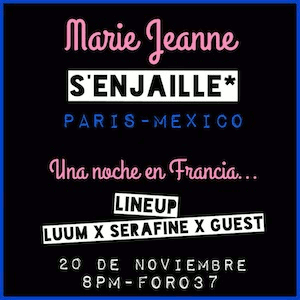 Marie Jeanne t'invite à entrer dans sa maison musicale pour découvrir l'ambiance des clubs français, depuis Mexico. Des DJ's français, surtout, mais parce que Marie Jeanne a posé ses valises à Mexico, elle fait aussi place aux DJ's mexicains. Marie Jeanne, c'est un échange artistique entre la France et le Mexique, une fille marquée par la culture électronique des deux côtés de l'Atlantique, une aventurière des clubs: Marie Jeanne, c'est la classe à la française, la femme parfaite. Le 20 novembre prochain, tu pourras la rencontrer au Foro 37 (Londres 37 Colonia Juarez). Pour toutes informations supplémentaires, tu peux contacter Léo SGB et Cha de la Taverne, les parents de Marie Jeanne mariejeanne.events@gmail.com |