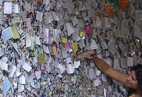 (Photo LPJ - Le porche de la maison de Juliette recouvert de post-it, graffiti et chewing-gum)