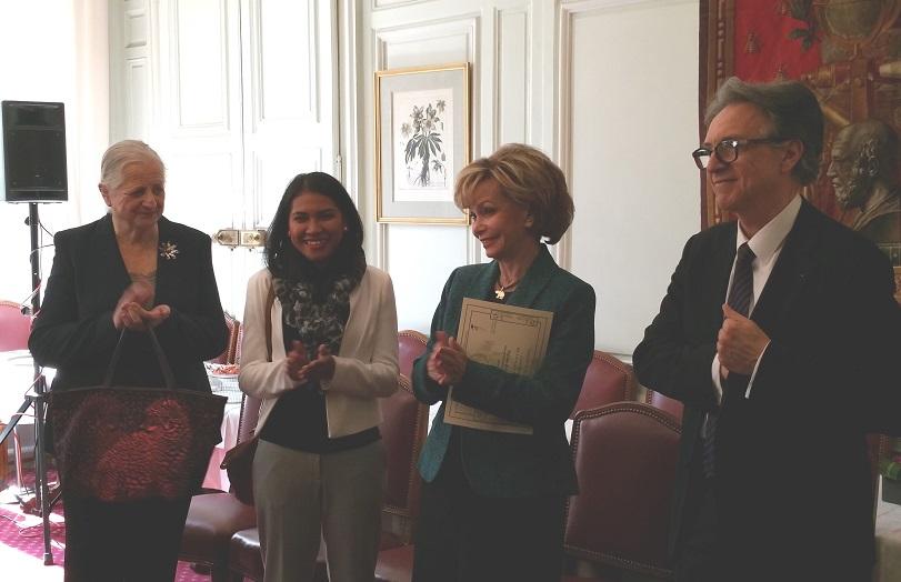 photo : de gauche à droite : Mme Françoise de Oliveira, Vice-Présidente d'honneur de Défense de la langue française, la lauréate Elodie Rakotobe, Mme le Sénateur Jacky Deromedi, M. Jean-Claude Jacq, Secrétaire Général de la Fondation Alliance française.