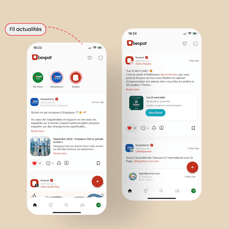 Nous développons ici une application qui est entièrement gratuite pour les utilisateurs. Ces derniers ont la possibilité de créer un compte, ou une page s’il s’agit d’une personnalité, d’une entreprise ou de blogueurs par exemple. Les pages ont des fonctionnalités plus abouties que les comptes. A l’instar d’Instagram, de Facebook, de LinkedIn ou Twitter, nous avons pris toutes les fonctionnalités sociales des réseaux sociaux, puis nous avons ajouté une touche « frenchy », secoué la boîte, et ça a donné Bexpat.