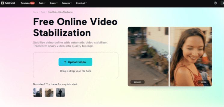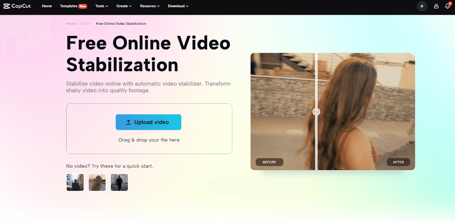 Dans la série d'étapes consécutives, la deuxième étape vous permet de gérer le téléchargement de la vidéo. Pour réussir à télécharger la vidéo, vous avez deux choix. Un choix par glisser-déposer ou en cliquant sur l'onglet de téléchargement de vidéo. La deuxième fonction vous permet d'ouvrir l'emplacement vidéo qui se trouve directement dans le dossier ou le lecteur en cliquant sur l'onglet de téléchargement de vidéo. Une fenêtre vous aidera tout au long à cet égard. La première fonction est la fonction glisser-déposer, en choisissant De cette façon, vous pouvez sélectionner le fichier et le faire glisser vers la zone de téléchargement sur la page des outils. Il s'agit d'un moyen plus rapide et plus instantané de télécharger vos vidéos. Vous n'avez pas à vous inquiéter si vous n'avez aucune vidéo à stabiliser. Le stabilisateur vidéo vous propose trois exemples de vidéos pour tester les performances et l'efficacité de l'outil. Cliquez simplement sur l'une des vidéos pour voir les résultats.