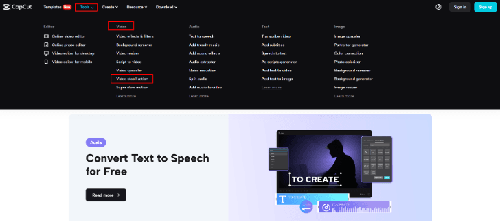 Si vous souhaitez utiliser cet outil, la première chose à faire est de visiter la page Web ou la page de destination du stabilisateur vidéo. Lorsque vous aurez fait cela, vous remarquerez une barre de menu présente en haut de la page. Vous pouvez afficher les multiples options qui existent sur la plateforme principale. L'outil est également une option parmi la liste. Vous devez sélectionner cet outil en cliquant dessus. Ce faisant, vous pouvez ouvrir un menu contenant divers outils. Les catégories clés incluent les sections image, vidéo, audio ainsi que les sections d'édition. Vous devez accéder à la catégorie vidéo et effectuer la sélection pour l'outil de stabilisation vidéo.