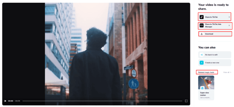 Lorsque vous êtes entièrement satisfait du résultat, vous pouvez commencer le processus de téléchargement. Veuillez noter que le processus de téléchargement vous permet de modifier légèrement la vidéo avant de la télécharger. Vous pouvez voir l'onglet d'exportation dans le coin supérieur droit. Il apparaît lorsque l'IA a terminé son rôle. Vous devez cliquer sur cet onglet. Après cela, le nombre d'options apparaît. Les options courantes incluent le partage TikTok, les publicités TikTok, le téléchargement et les outils magiques. Les outils magiques vous aident à poursuivre l'édition dans le processus. Par exemple, vous pouvez modifier la vitesse, la lumière ou le flou à l'aide de l'outil magique. Plus tard, vous pourrez télécharger la vidéo telle quelle.