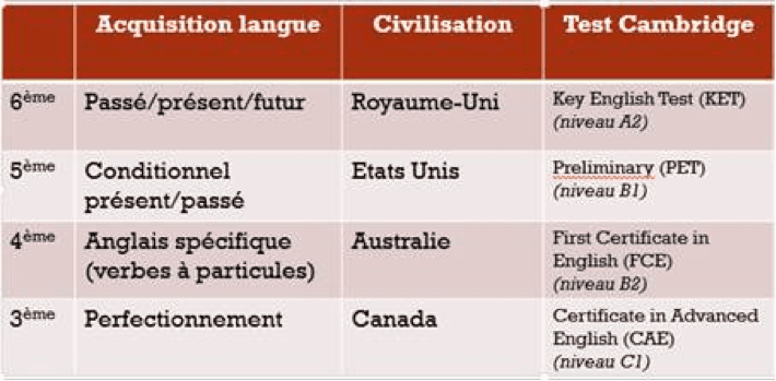 - Examens : du KET en 6ème jusqu’au CAE en 3ème, l’élève a la possibilité, chaque année, de passer un examen de Cambridge.