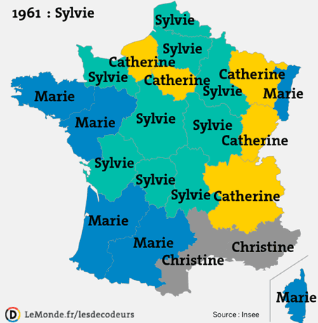 Le Monde a réalisé, à partir des données de l'Insee, une carte de France des prénoms, entre 1946 et 2011. Cette carte interactive n'est maintenant accessible qu'aux abonnés mais vous pouvez la retrouver ici également.