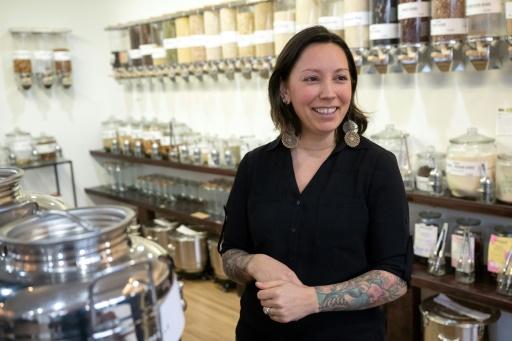 Au magasin Mason & Greens de Washington, les clients apportent leurs propres sacs ou contenants en plastique pour les remplir d'articles vendus sans emballages.