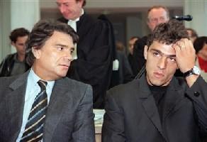 Tapie (àgauche) avec J-J Eydelie pendant le procès OM-VA. (Photo : AFP)