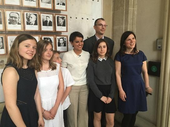 Les élèves de 5ème1, La ministre de l'éducation nationale Najat VALLAUD-BELKACEM, le proviseur Pascal MEYER et Sandrine GENDREAU professeur d'histoire géographie, le 9 mai 2016 à Paris