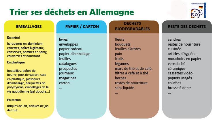 Pour les non-initiés, le système allemand de tri des déchets peut vite devenir un casse-tête, au point de ne plus savoir quoi jeter dans quelle poubelle. La collecte des déchets est généralement gérée non pas par les municipalités elles-mêmes mais par des sociétés privées. Les règles de tri peuvent alors varier selon le lieu d'habitation. Dans la région Rhin-Main, quatre poubelles sont à la disposition des habitants :