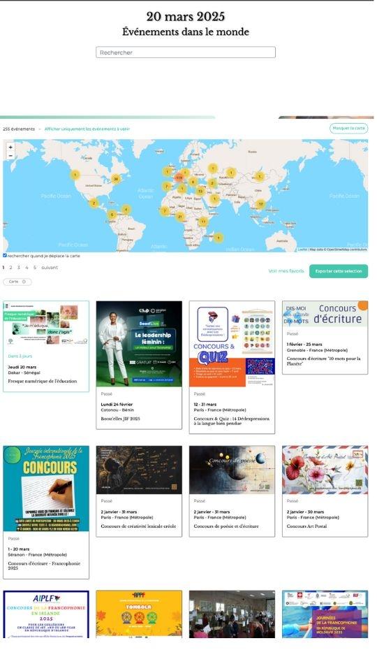 L’Organisation internationale de la Francophonie (OIF) propose une carte interactive recensant les événements des célébrations. Plus qu’un simple outil de localisation, elle permet à chaque organisateur d’y inscrire facilement ses manifestations.