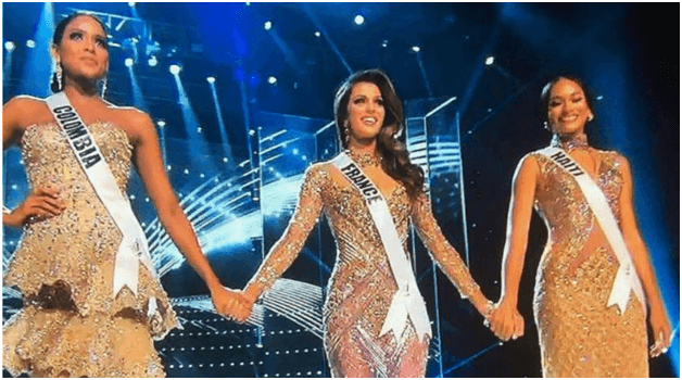 Apres avoir annonce que Miss Colombie était à la troisieme place, la française et l'haïtienne, de 8 centimètres plus grande que sa rivale, se faisant face en se tenant les mains, attendirent pendant un long moment pendant lequel la tension nerveuse était à son paroxysme, que le comédien américain prononcé le nom de la gagnante. Cette année, il ne s'était pas trompé !