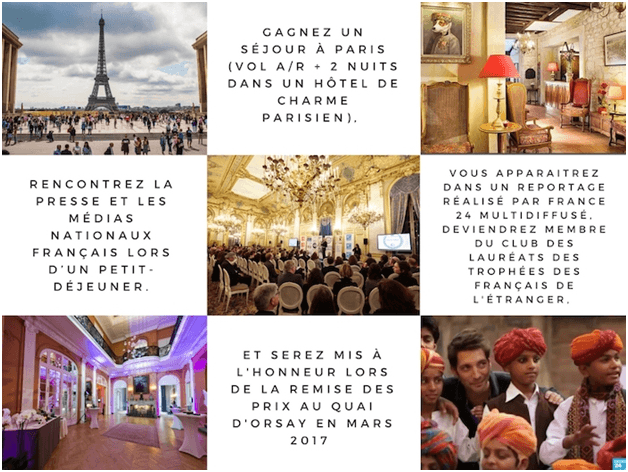Les Trophées des Français de l'étranger seront remis en mars 2017 lors d'une soirée de prestige à Paris. Ils récompenseront les parcours les plus emblématiques dans les catégories suivantes :