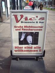 A quelques mètres de la sortie de métro Sankt-Pauli, Vic's appelle à l'harmonie entre fumeurs et non-fumeurs en clamant que tous sont bienvenus chez lui. Sous une grande baie vitrée, façon jardin d'hiver, on déguste une grande salade, un café ou un cocktail sans avoir l'impression pénible d'être parqué dans un No man's land tabagique. Parce que fumer peut être un plaisir, surtout après le repas.