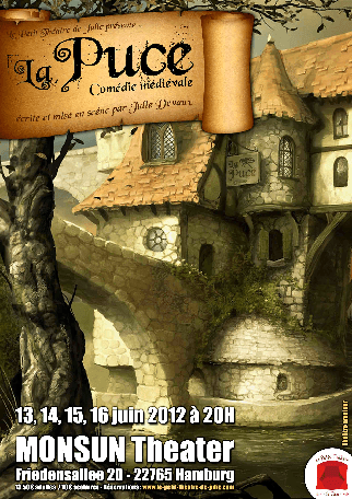 Depuis plusieurs années, les représentations se déroulent au Monsun Theater, dans le quartier d'Altona. Julie Devaux a déjà présenté dans ce théâtre des pièces de sa création joué par des adolescents ; en 2012, La Puce est la première pièce qu'elle a écrite qui sera joué par des adultes au Monsun Theater. "J'ai écrit la pièce sans penser aux comédiens", nous confie-t-elle alors que les premiers comédiens arrivent à la répétition hebdomadaire. Mais, les acteurs ont tellement endossé leur rôle qu'ils n'envisagent pas du tout d'en changer? L'équipe qui donnera les représentations mi juin s'est constituée il y a bientôt deux ans et a commencé par de l'improvisation. "Et quand un de nous est absent à la répétition ? c'est rare - , cela n'est pas pareil", ajoute Nathalie, alias Aénor.