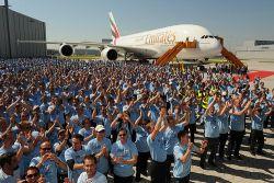 Les salariés du site d'Airbus à Hambourg lors de la remise du premier A380 à Emirates Airlines (photo : Flikr / Adb Rabbo)