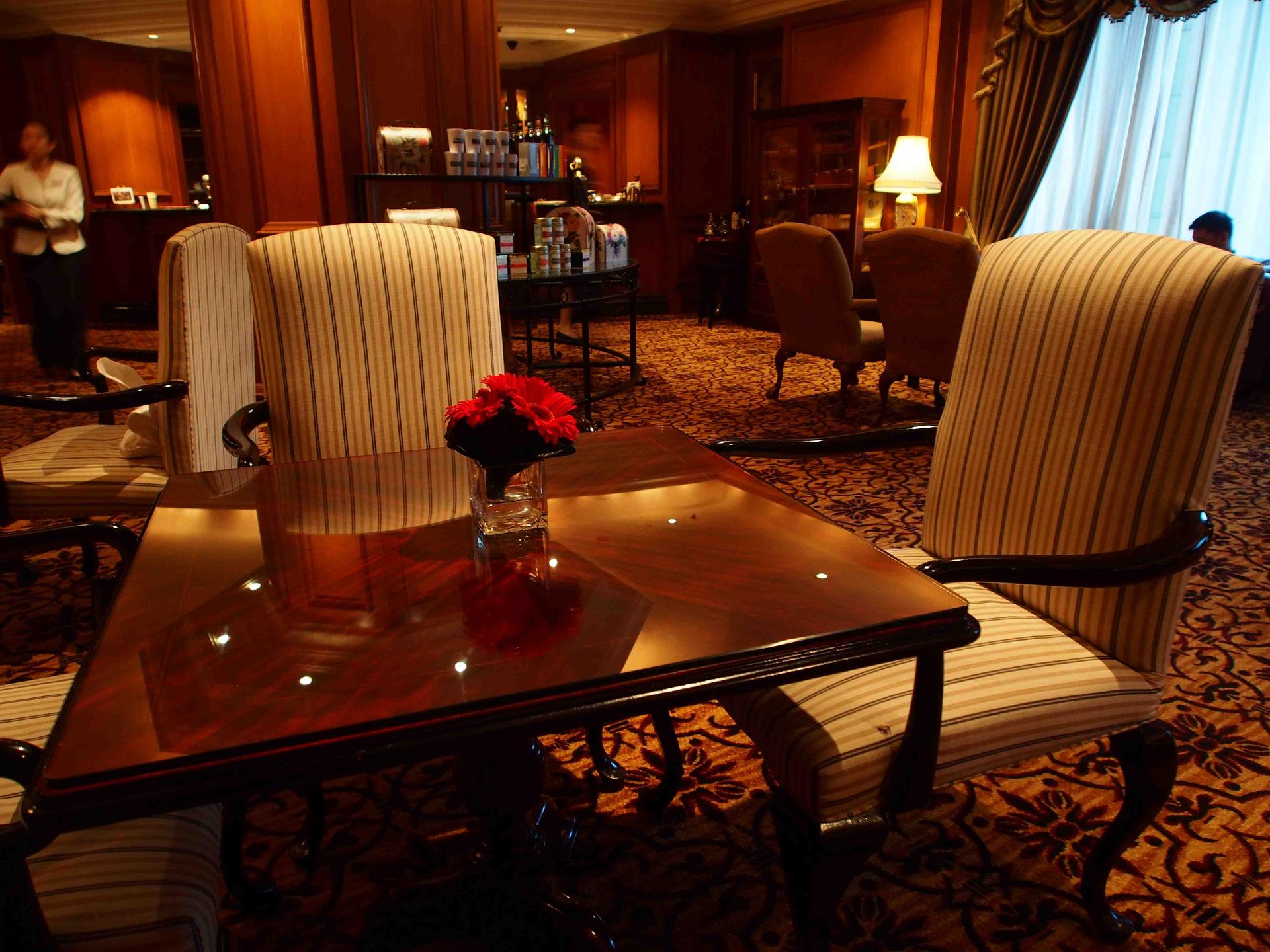 Direction le Lobby Lounge : moquette, boiseries, drapés et lumière douce, offrent à ce salon une atmosphère particulièrement chaleureuse et cosy. A peine installées, le doux murmure d'une harpe envahit la pièce, lui donnant des allures d'un autre temps. A l'entrée du salon, une harpiste en effleure délicatement les cordes pour accompagner ce moment avec raffinement.