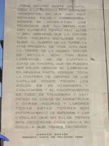 Vous avez, tout autour de ce circuit, des pièces tout à fait adorables, dans lesquelles il y a des salles très grandes et des couloirs où logent les religieux qui vivent ici il y a bien quarante tours très hautes et bien construites, et la plus haute possède une cinquantaine de marches pour monter en son coeur. La tour principale est plus haute que la tour de la grande église de Séville. Les ouvrages sont si bien travaillés, qu'ils soient en pierre de taille ou de bois, qu'aucun détail ne pourrait être amélioré, car toute la pierre de taille de l'intérieur des chapelles où ils conservent leurs idoles est faite de broderies et de galetas. Et le bois est tout en maçonnerie de mosaïques de monstres et autres figures et ?uvres. Toutes ces tours sont des sépultures, et les chapelles qu'on y trouve sont chacune dédiées à l'idole qui fut l'objet de dévotion du défunt.