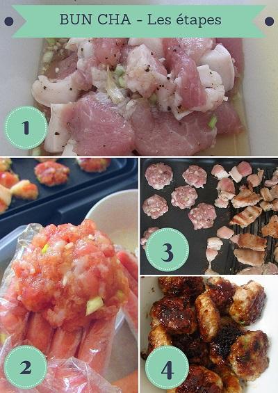 - Pendant que la viande marine, préparer la sauce Nước mắm avec tous les ingrédients de la sauce dans l'ordre : vinaigre, sucre, mélanger, eau, mélanger, nuoc mam ? mélanger + piment.