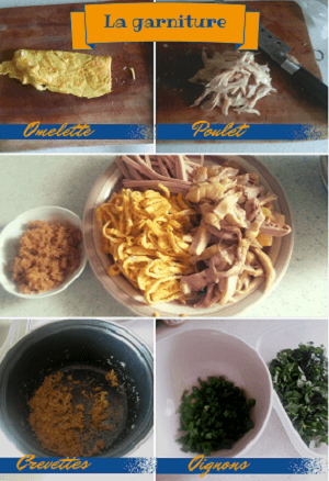 ? Omelette : Dans un bol, battez les ?ufs légèrement, ajoutez un peu de nuoc mam. Dans une poêle légèrement huilée et chaude, répartissez les ?ufs battus sur toute la surface pour obtenir une omelette fine comme une feuille. Renversez l'omelette sur une planche et tranchez très finement.