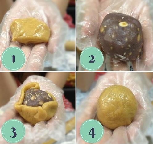 ? Pour la pâte, faites de même, mais la boulette de pâte doit être un peu plus petite que la boulette de farce : Aplatissez la pâte avec les mains, mettez la farce au milieu, poussez tout doucement la pâte vers le haut de la farce afin de la recouvrir. Roulez la boulette sur un peu de farine avant de la mettre dans le moule.