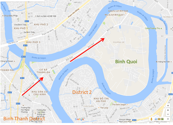Située au-dessus du district 2, la presqu'île est accessible par la route Xô Viet Nghê Tinh. Une fois le pont passé, on arrive sur l'artère principale : Binh Quoi.