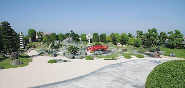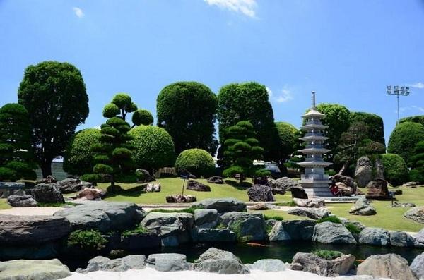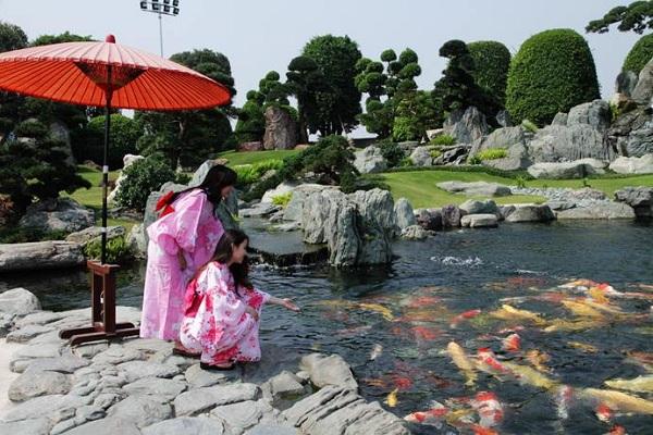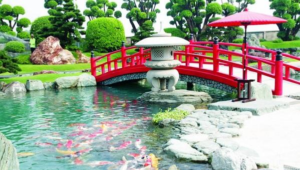 Le parc a été conçu harmonieusement selon les codes japonais avec plus de 4.000 tonnes de roches, des centaines de vieux bonsaïs et un grand étang peuplé de nombreux poissons.
