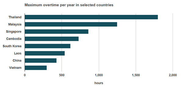 En regardant ce graphique il est évident que le Vietnam possède une limite d'heures supplémentaires beaucoup plus stricte que ses voisins.