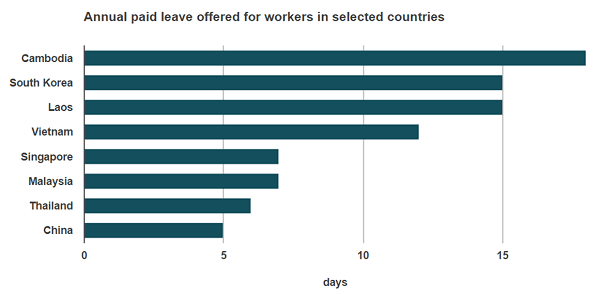 Concernant les congés payés, les employés vietnamiens ont le droit à 12 jours par an (soit 1 jour par mois). Bien que cela paraisse peu aux yeux des européens, le Vietnam offre plus de congés payés que la plupart des pays voisins.