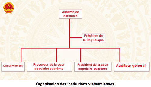 Sur l'organigramme ci-dessous, issu du journal Tuoi Tre, on peut voir par exemple que le pouvoir exécutif procède théoriquement du pouvoir législatif. En revanche, rien n'est dit sur le rôle du Parti sur ce document.