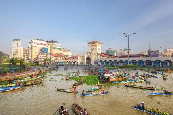 Le rondpoint du marché Ben Thanh transformé en marché flottant en référence au Delta du Mékong