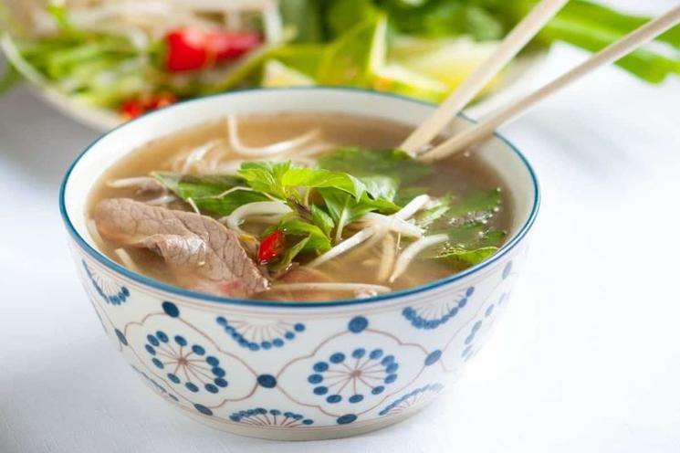 Autre exemple : le bouillon dans les soupes vietnamiennes occupe ainsi une place beaucoup plus importante qu'en France. Il est aussi consommé intégralement, tout comme les os. Ces différences s'expliquent, d'après Didier Corlou, maître cuisinier et chef des restaurants Sices Verticale et Co Mai, par les longs embargos qui ont considérablement appauvri le pays. « Aujourd'hui, ajoute-t-il, cette manière de manger est qualifiée de diététique, mais ce n'était pas l'idée initiale ! »