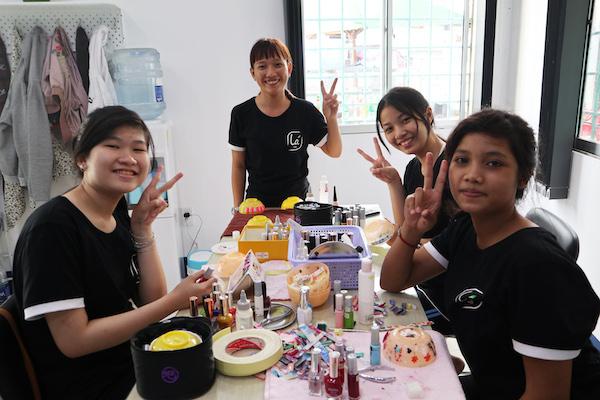 En mai 2018, une étude réalisée par l’ONG Friends International, spécialisée dans la mise en place d’entreprise sociale, mettait en évidence le marché en plein développement des prothésistes ongulaires (avec une demande en croissance des clients et des réseaux sociaux qui mettent cette discipline en valeur) et l’attrait des jeunes pour cette profession. Un local fut mis à disposition quelques mois plus tard par le centre de formation Nhan Dao, et l’équipement du salon principalement financé par l’Agence Française de Développement (AFD) et le Secours Catholique. "Au sein de l’association PE&D - qui travaille déjà sur l’accompagnement familial et les formations professionnelles, le projet 360 -, nous voulions une branche plus innovante, raconte Camille Gravier, nous avons donc créé un atelier de formation de toutes pièces, qui permette aux jeunes de pratiquer en direct, sur de vrais clients." Ainsi, la shop manager, professionnelle diplômée en manucure, dispense aujourd’hui ses cours pratiques à trois étudiantes, dont la formation est payée grâce aux profits du salon et à une bourse d’études donnée par un couple de Singapouriens. "Cette formation se fait en 3 parties, détaille Camille : comment faire une manucure et mettre du vernis ; le nail art, plus créatif, aux dessins plus précis ; et enfin c’est assez pointu : les ongles en acrylique. On se sert d’une poudre, d’un liquide spécial etc., c’est très technique, mine de rien ! (Rires)"