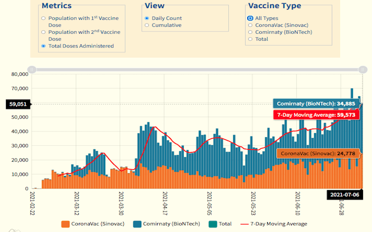Parmi ceux qui ont eu la première dose de vaccin, 1.030.259 personnes ont choisi le vaccin Sinovac et 1.410.500 personnes ont opté pour le vaccin BioNTech - parmi eux les personnes qui ont été infectées par le coronavirus dans le passé ne se feront vacciner que d'une seule dose, 11.945 personnes sont concernées à ce jour. Concernant la deuxième dose, 675.976 personnes se sont fait vaccinées au Sinovac, tandis que 969.310 personnes ont reçu le vaccin BioNTech.