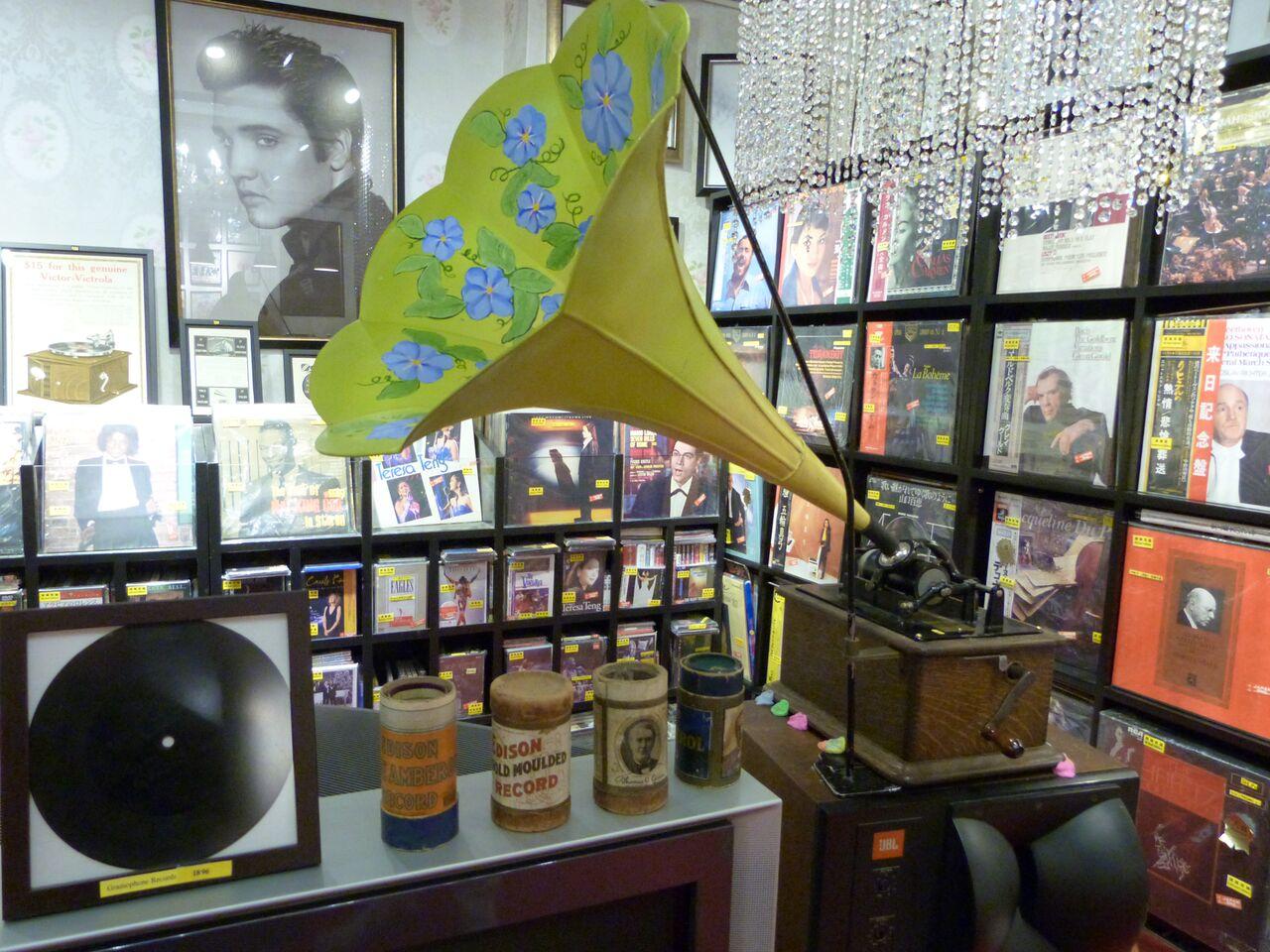 Le premier phonographe d'Edison exposé chez Sam The Record Man devant un portrait du King
