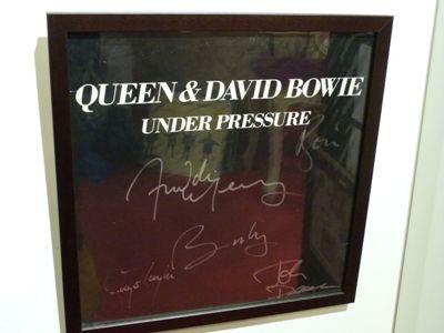 La pochette du 33 tours Under Pressure (single enregistrée par David Bowie et les Queen en 1981) dédicacée par tous les membres du groupe