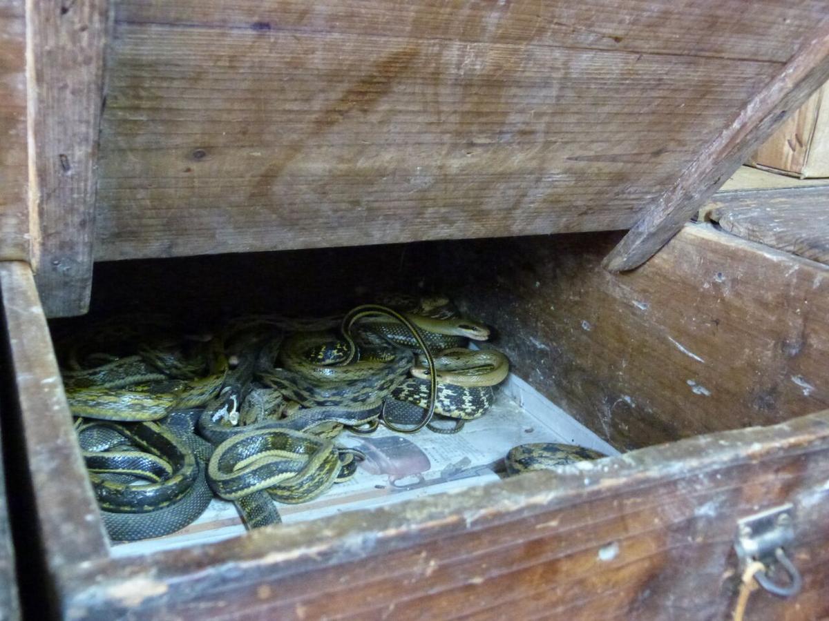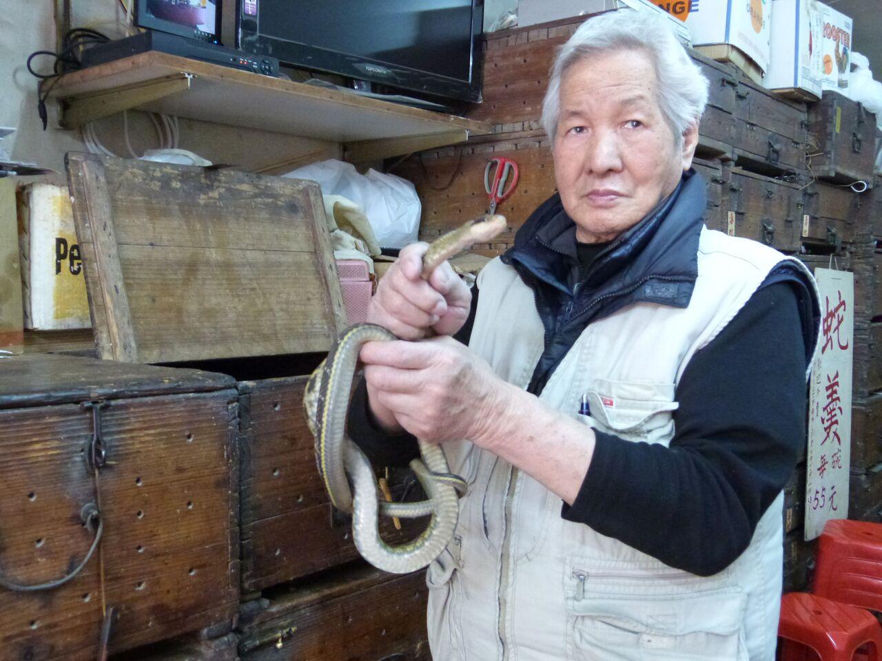 Dans l'unique salle de l'échoppe, nous sommes accueillis par Lak, un imposant vieil homme, qui dépêche un aimable serveur pour nous expliquer ce que son anglais inexistant ne peut nous dire. Pour nous, il ouvre l'un des nombreux casiers noirs qui habillent les murs du restaurant et saisit un grand cobra, qui, de toute évidence, apprécie peu d'être dérangé et de se retrouver face à l'objectif. « Beautiful » murmure le serveur, plein de respect. Comme tous les autres spécimens présents, le reptile vient de Chine. A Hong Kong, les serpents sont une espèce protégée. Lak, quant à lui manipule la longue bête sans danger. Il travaille ici depuis 56 ans et sait comment les toucher. « Certaines personnes savent les prendre en main. Ils ne craignent rien. » explique le serveur. C'est ce savoir-faire qui manque aujourd'hui et qui, selon lui, menace la profession. Un peu plus tard, l'homme nous montre un autre animal, un long reptile jaune et noir. « Celui-ci est très dangereux », prévient-il. Il s'équipe pour la peine d'un gant unique, une protection exceptionnelle qui semble bien maigre face au danger.