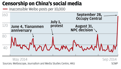 Comme le montre ce graphique publié par le SCMP en début de semaine, le mouvement de désobéissance civile de Hong Kong a provoqué une véritable inflation des messages censurés sur le site chinois de microblogging. Selon le weiboscope, un programme de l'université de journalisme de Hong Kong, cité par le quotidien, le nombre de messages rendus inaccessibles a été multiplié par cinq entre vendredi et samedi.
