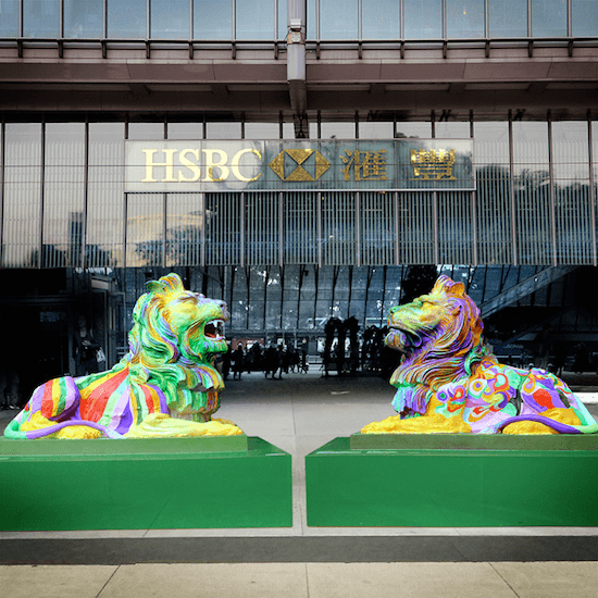 La banque HSBC s'est attiré les foudres des défenseurs des valeurs de la famille pour avoir installé, au pied de son bâtiment historique, deux lions repeints aux couleurs de l'arc-en-ciel, dans une campagne en faveur des droits des minorités sexuelles.