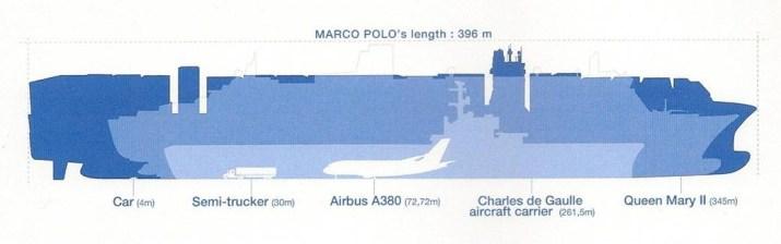 Construit au chantier naval sud-coréen de DSME (Daewoo Shipbuilding & Marine Engineering) dans la baie d'Okpo sur l'île de Goeje près de Busan, le Marco Polo est un navire monumental aux dimensions exceptionnelles : 396 mètres de long, 54 mètres de large, 16 mètres de tirant d'eau ? tout beau tout neuf, il sent encore la peinture fraiche ?. sept étages dont un est spécialement équipé de cabines pour recevoir des passagers apréciant un mode de transport très particulier ... plusieurs ponts ?. des couloirs fantomatiques qui s'étendent à l'infini ? des odeurs, du bruit et de la chaleur dans des salles des machines à l'échelle du reste du navire ? le plus surprenant ? Savoir que seules 25 personnes suffisent à opérer ce mastodonte ... un équipage croate et philippin sur un navire construit en Corée du Sud battant pavillon britannique appartenant à une entreprise française pour transporter des produits chinois vers le reste du monde, existe-t-il plus bel exemple de mondialisation ?!
