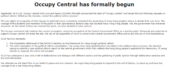 Face à la forte mobilisation des étudiants (en grève depuis lundi) qui ont fait irruption à Tamar square vendredi devant le siège du gouvernement, le mouvement de désobéissance civile qui avait prévu un grand "banquet" pro-démocratie à Chater Garden mercredi à l'occasion du 65ème anniversaire de la République populaire de Chine a finalement changé ses plans et enjoint ses partisans à rejoindre les manifestants d'Admiralty dès ce week-end.