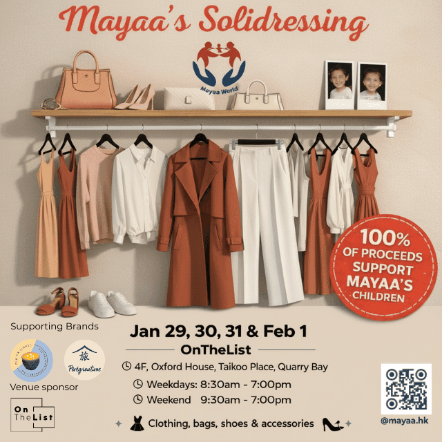 Mayaa organise Mayaa’s Soli’dressing, une vente solidaire dédiée à la mode de seconde main, qui se tiendra les 29, 30, 31 janvier et le 1er février chez OnTheList (4F, Oxford House, Taikoo Place, Quarry Bay). Des pièces soigneusement triées pour femmes et enfants (vêtements, chaussures, sacs et accessoires) seront proposées à des prix allant de HKD 30 à HKD 700. Le point clé : 100% des bénéfices de la vente de seconde main sont reversés à Mayaa, une ONG qui promeut l’éducation des enfants à Hong Kong et au Népal. L’événement allie consommation responsable et impact social, en permettant à chacun de soutenir l’éducation tout en chinant de belles pièces. Les visiteurs pourront trouver des articles de marques variées, notamment ba&sh, Claudie Pierlot, Sézane ou Ralph Lauren pour les femmes, et Jacadi ou Petit Bateau pour les enfants (et bien d’autres). Mayaa’s Soli’dressing est accueilli avec le soutien d’OnTheList en tant que Partenaire du lieu. Les marques solidaires Old HK Lights et Pérégrination seront également présentes sur place pour soutenir la cause. « Le Soli’dressing est un rendez-vous clé de Mayaa, que nous faisons vivre depuis plusieurs années. C’est un événement à la fois éco-responsable, grâce à la seconde main, et solidaire : chaque achat nous aide à financer concrètement l’éducation des enfants que nous accompagnons à Hong Kong et au Népal. » Fanny Riou Responsable en charge des évènements pour Mayaa