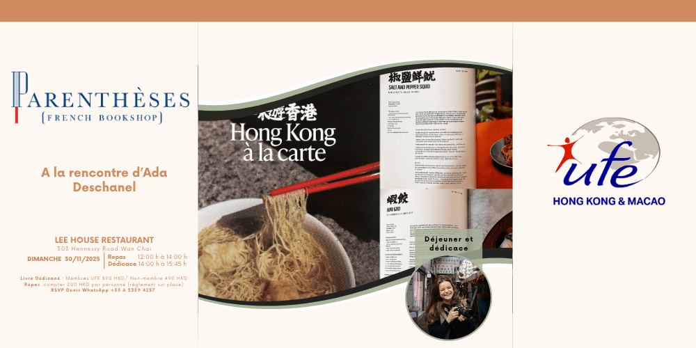 Remarques : - Grâce à notre partenaire Parenthèses, les membres UFE bénéficient d’un tarif spécial sur le livre : 390 HKD au lieu de 490 HKD. - Repas : compter 200 HKD par personne, le tarif exact vous sera communiqué plus tard. IMPORTANT : Pour permettre l’organisation logistique (notamment la disponibilité des livres le jour J) merci de vous inscrire au numéro +33635394257 en indiquant : votre choix de formule, le nombre de personnes pour le déjeuner, et le nombre d’exemplaires du livre que vous souhaitez.