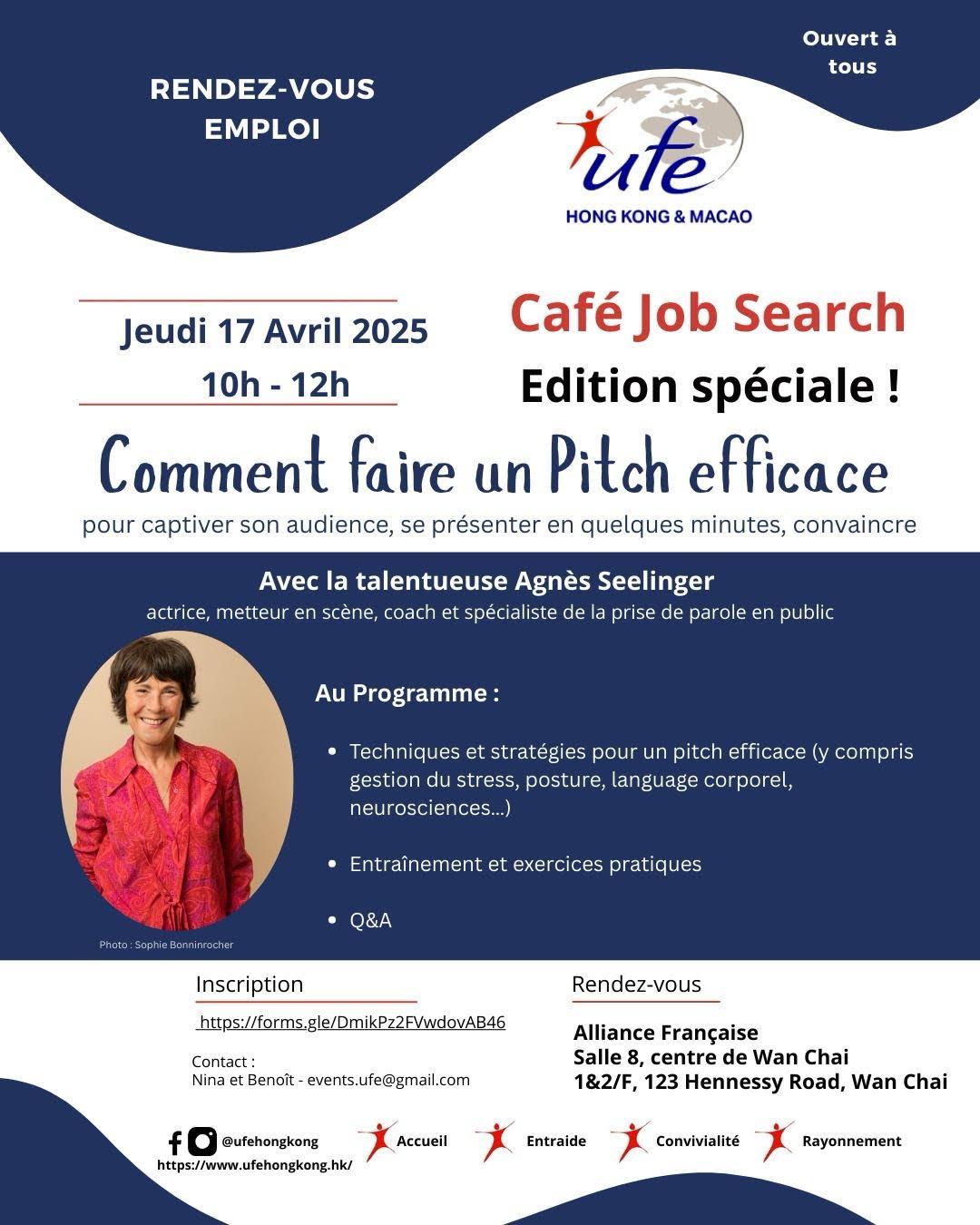 Une édition spéciale du Café Job Search de l'UFE, pour un pitch efficace. Captiver, convaincre, se présenter en quelques minutes… C’est tout l’enjeu de ce Café Job Search du mois d’avril ! Il est destiné à tous les job seekers, et celles et ceux qui souhaitent améliorer leur impact à l’oral. Venez écouter Agnès Seelinger – actrice, metteuse en scène et coach en prise de parole – qui partagera ses techniques et conseils. Au programme : • 💡 Astuces pour un pitch efficace : posture, stress, langage corporel, neurosciences… • 🎯 Exercices pratiques • ❓ Q&A avec Agnès