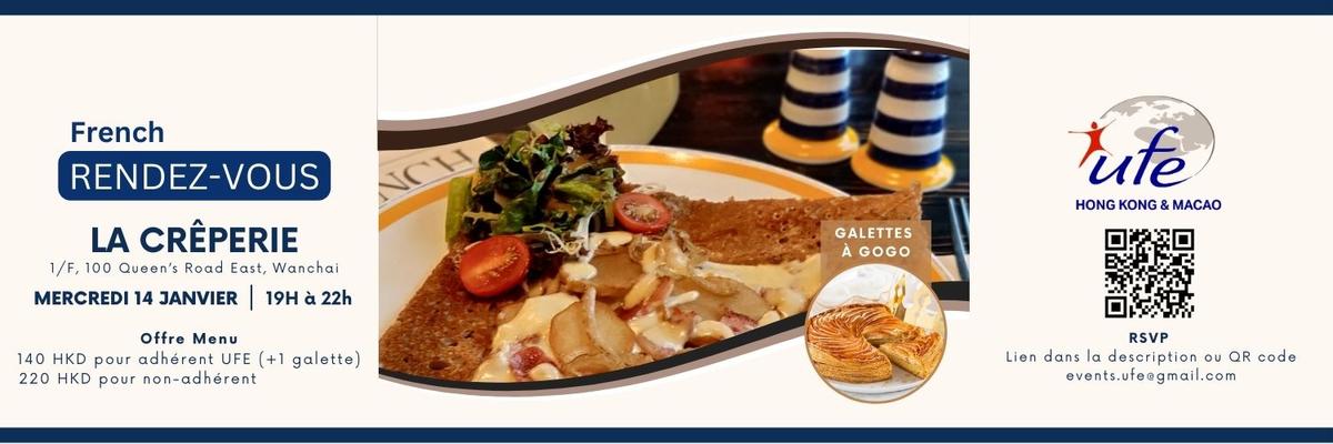 Pour le premier French rendez-vous de l'année, nous ne pouvions pas passer à côté d'une galette. Mais pourquoi se limiter à une seule sorte ? L'UFE vous propose un menu spécial. Un verre de bienvenue, une entrée, et au choix une galette salée (6 options possibles, dont la végétarienne) ou une salade saumon, ou des pâtes à la truffe ! Le dessert ? Des crêpes, ou de la galette des rois !