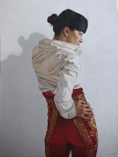C'est un peu une énigme pour moi. Il y a bien sûr le costume, les broderies, l'éclairage, quelques citations modestes de Velázquez. Mais peut-être faut-il chercher du côté d'une certaine idée de la tradition et de la peinture qui est peut-être ici dans sa manière réaliste universellement lisible. C'est d'ailleurs pour moi un peu une revanche. Car quand je peignais comme cela il y a quinze ans, on me disait en France "bravo pour la technique mais ce type de peinture n'est pas intéressant". Or, je sens ces dernières années une espèce de retournement.