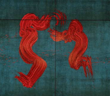 Pendant que je travaillais sur les maîtres flamands, j'ai ouvert plein de petites portes d'explorations extraordinaires et notamment ces ondes cosmiques, ce dernier tableau que je montre à Hong Kong, noir sur fond noir lumière, pour lequel j'ai dématérialisé complètement le pinceau pour me libérer de son poids et ne garder que la réserve intérieure. En me déplaçant dans l'espace avec ce nouvel outil, j'ai inventé ce que j'appelle les walking paintings, c'est-à-dire des marches peintes avec cet écoulement de matière du c?ur du pinceau. Ça crée comme des ondes qui traversent l'espace, des champs d'énergie et la réfraction de la lumière sur la crête de ces frissonnements de vie qui circulent d'un endroit à l'autre nous font découvrir des paysages abstraits.