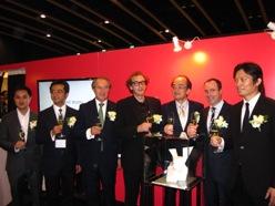 De gauche à droite : M.Calvin Hui (Fine art Asia), M.Andy Hei (Fine Art Asia), M.Dumonteil (Galerie Dumonteil), M. Jacques Owczarek (sculpteur), M. Kumamaru (consul général du Japon à Hong Kong), M.Barthélémy (consul général de France à Hong Kong), M. Hide Kasuga (Blanc Bijou)