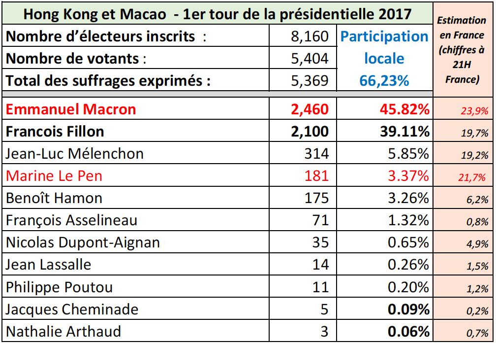 La majorité des voix à Hong Kong et Macao va à Emmanuel Macron (45,8%) et François Fillon (39,1%) qui totalisent à eux deux 85% des suffrages exprimés. Jean-Luc Mélenchon, puis Marine Le Pen et Benoit Hamon recueillent respectivement 5,8%, 3,35% et 3,26%.